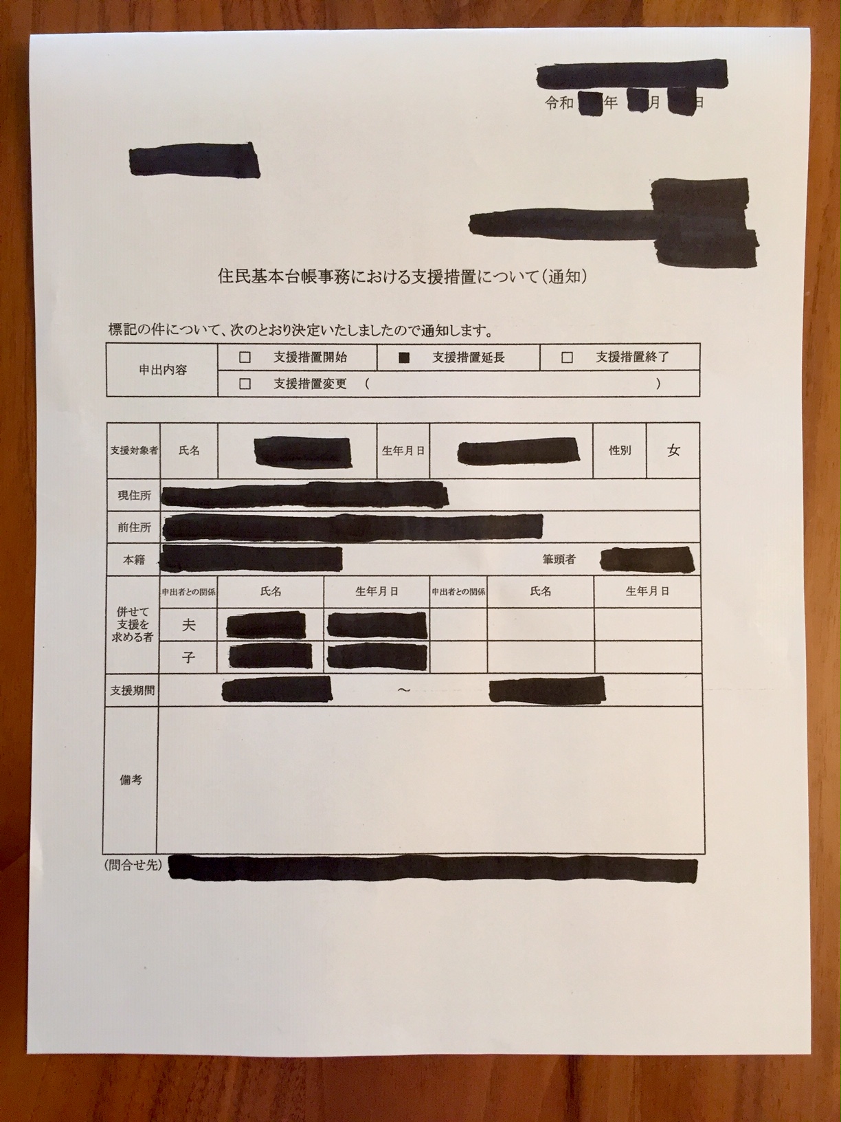 - 夫や子どもも一緒に支援してもらっているので、氏名欄にそれぞれの名前が記載されています。